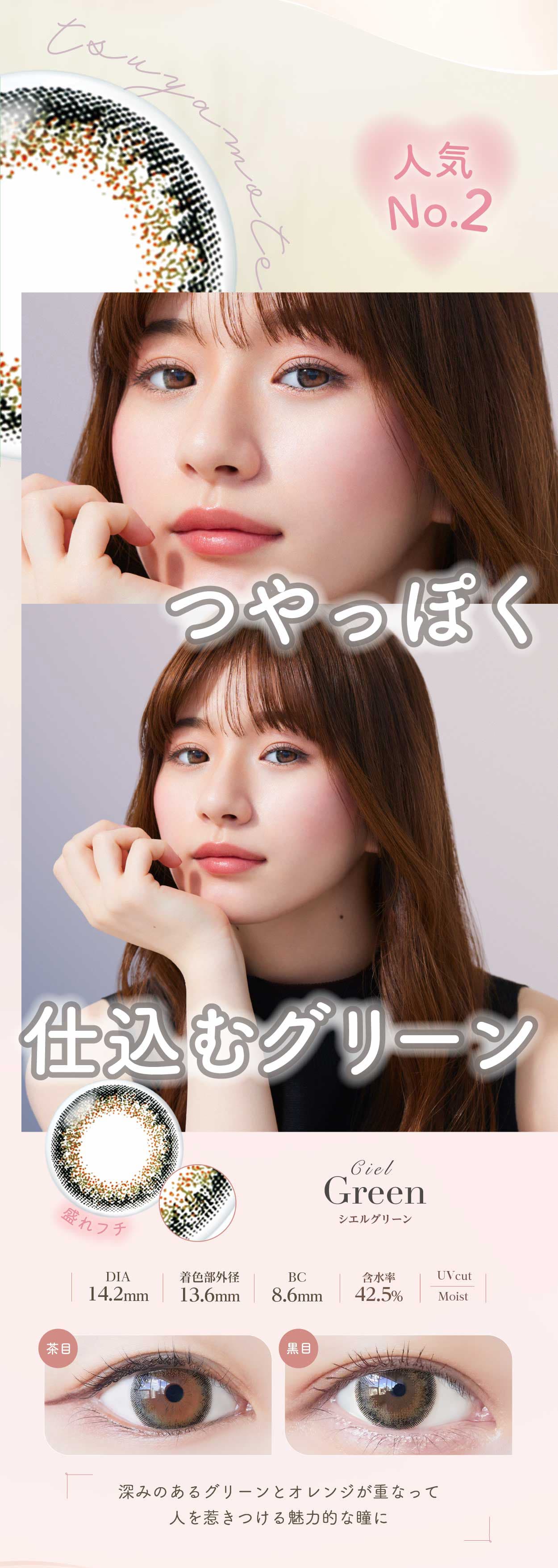 ほんのりと緑色に発色する細フチのニュアンスカラー。